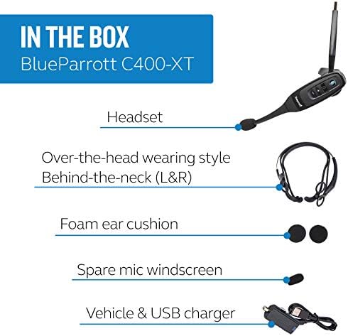 Includes: BlueParrott C400-XT headset, leatherette ear cushion, foam ear cushion, neckband (L & R), headband, USB cable, vehicle charger, 2 mic windscreens, quick-start guide