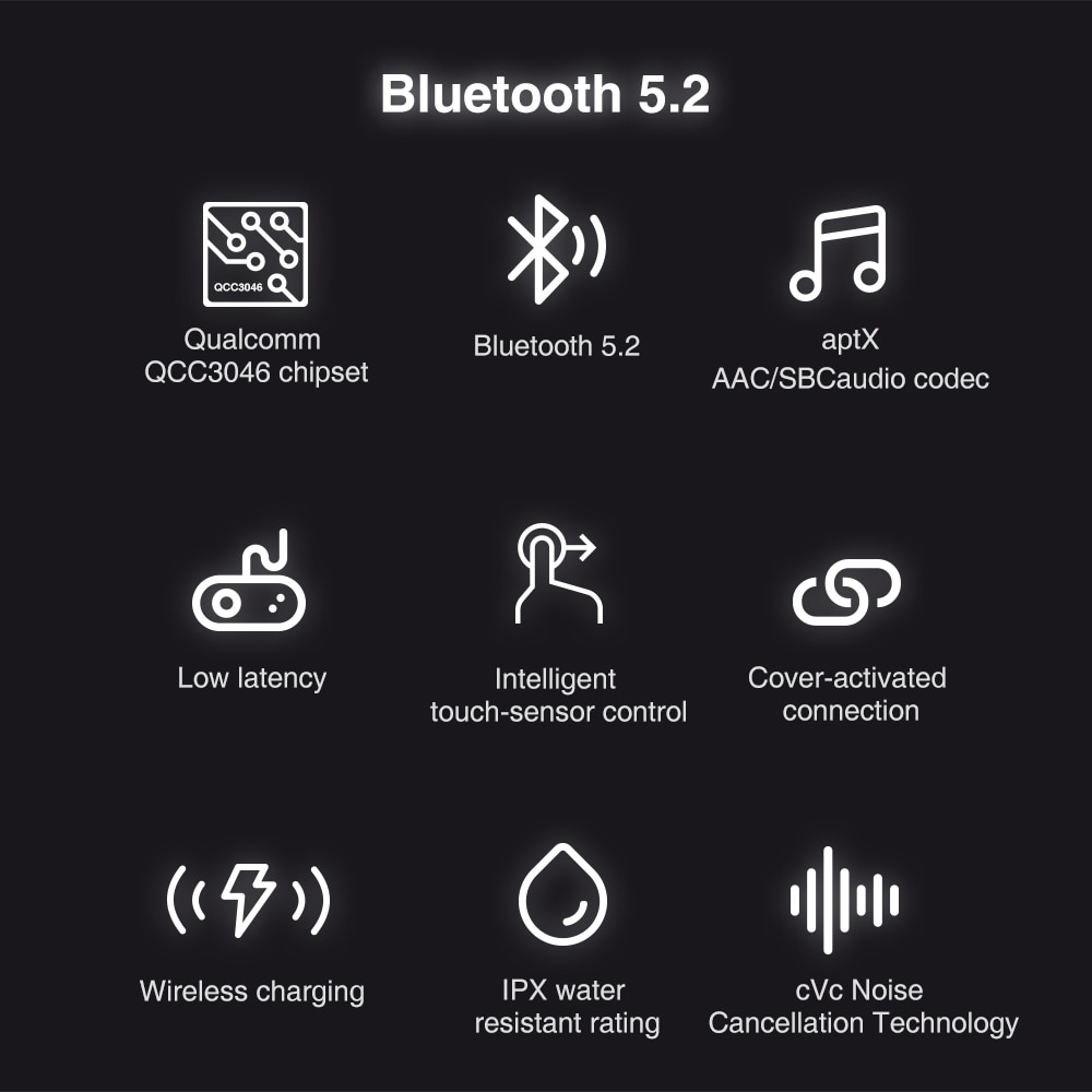 ♬【Smart Touch Control&Wireless Charging】The smart touch control will bring comfort and convenience. Seamless switching between call and music could be so cool. Moreover, it supports wireless or wired charging. No worries about forgetting bring a charger. The ultra-low power consumption of QCC3046 chipset can last up to 72 hours without the need for a recharge